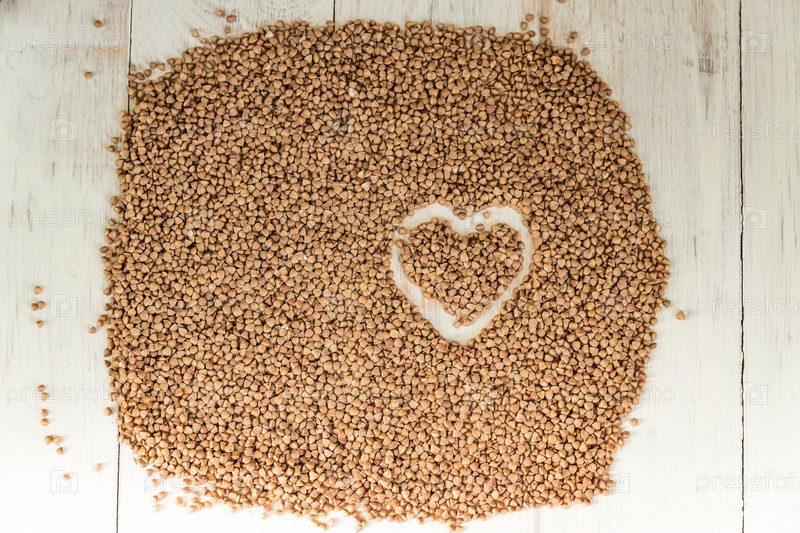 Фон гречихи с нарисованным сердцем. Безглютеновая и здоровая диета. Малая глубина резкости