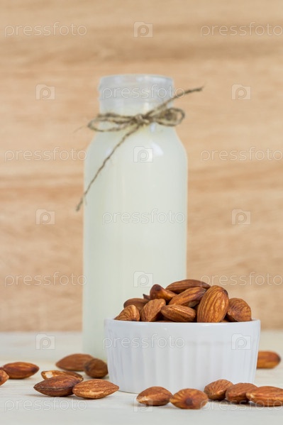 Домашнее миндальное молоко в бутылке и орехи в белой фарфоровой миске на деревянном фоне