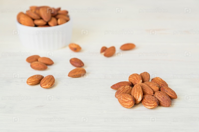 Куча жареного миндаля на белом деревянном столе, крупным планом, пространство для копирования
