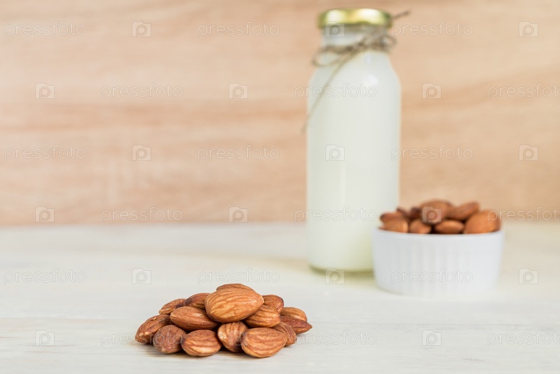 Жареный миндаль в белой фарфоровой миске на белом деревянном столе