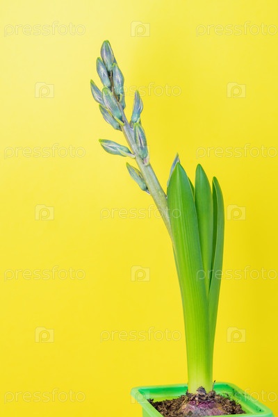 Синий цветок гиацинта закрыл бутон в зеленом транспортном пластиковом зеленом горшке на желтом фоне. Скопируйте пространство