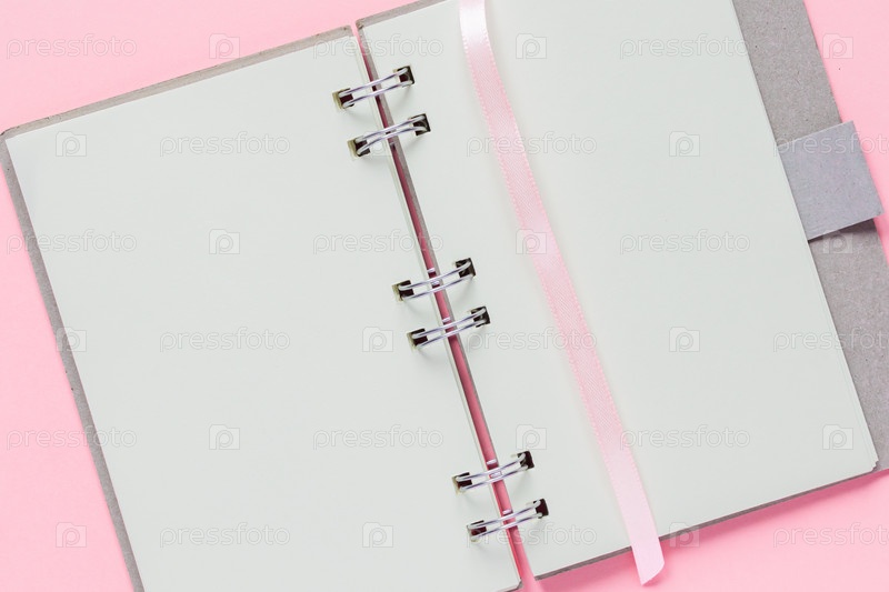 Крупный план открытого пустого блокнота с обложкой из переработанной бумаги на пастельно-розовом красочном фоне