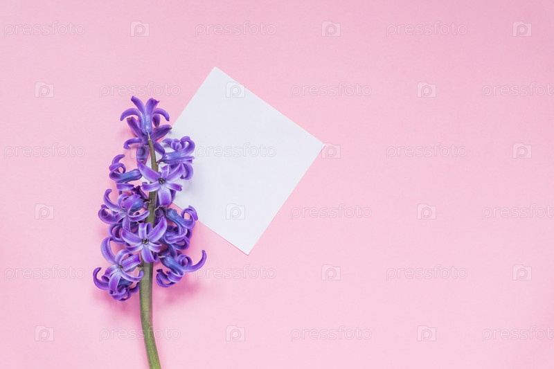 Макет. Пустая бумажная бирка с сиреневым гиацинтом на пастельно-розовом фоне. Вид сверху, плоская планировка с копией пространства