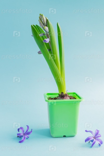 Синий цветок гиацинта закрыл бутон в зеленом транспортном горшке на синем фоне. Скопируйте пространство