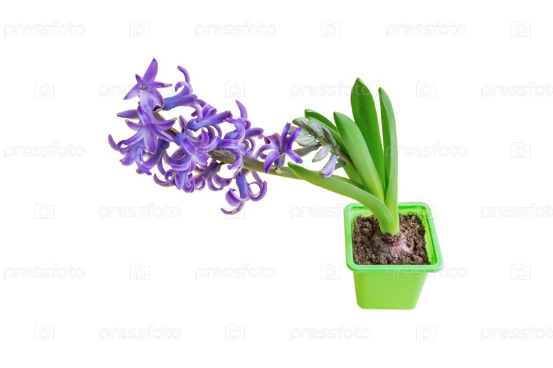 Синий цветок гиацинта в зеленом пластиковом горшке на белом фоне. Обтравочный контур