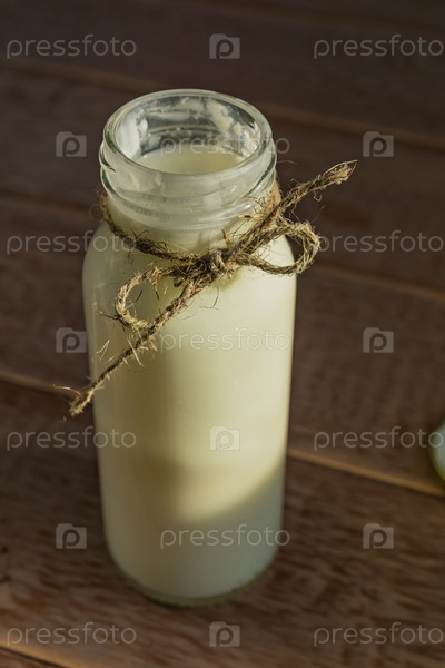 Открытая бутылка свежего молока на деревянном фоне. Натуральный диетический продукт