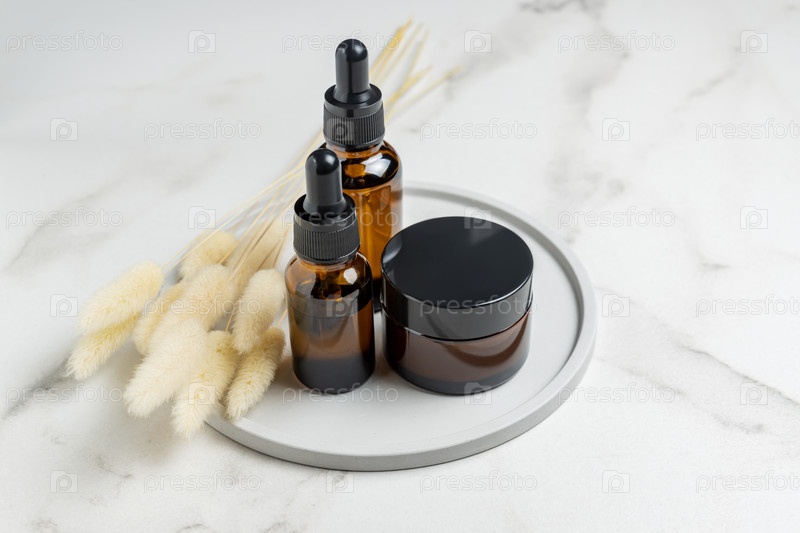Баночка для крема из темного стекла и флаконы-капельницы с маслом для лица на керамическом подносе. Макеты косметических контейнеров. Фон для презентации брендинга и упаковки. Концепция натуральной косметики по уходу за кожей