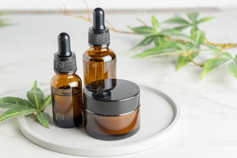 Альтернативная медицина, натуральная косметика. масло cbd, крем для лица в банке из темного стекла и косметические средства из листьев конопли на подносе на столе, пространство для копирования, макет дизайна