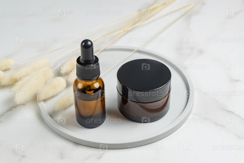 Два макета косметических продуктов на бетонном подносе на фоне бородки для презентации косметики. Креативная и модная презентация продукта