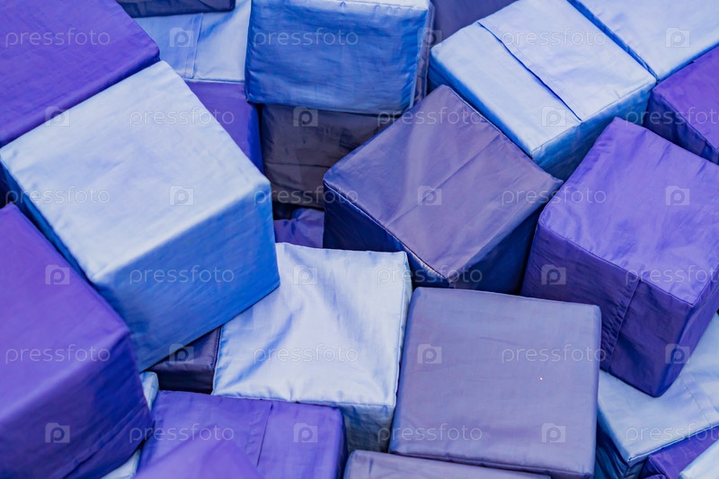 Много мягких синих блоков в детском сухом бассейне на игровой площадке. геометрические игрушки