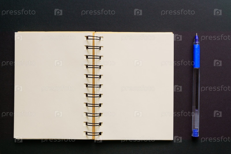 Концепция дизайна - Вид сверху на пустой крафт-блокнот и синюю шариковую ручку на черном фоне. макет