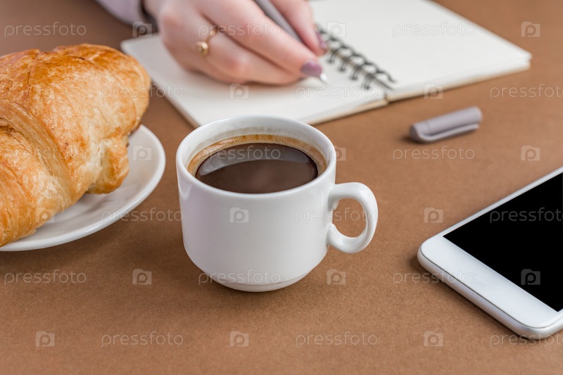 Перерыв на кофе с круассаном и эспрессом. Женщина пишет на блокноте. Фрилансер за работой