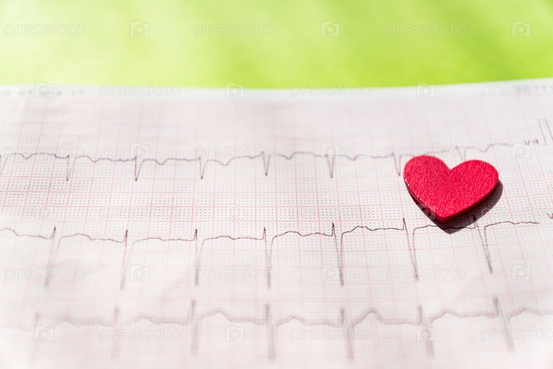 Закройте электрокардиограмму в бумажной форме с красным деревянным сердцем. Фоновая текстура бумаги ЭКГ или ЭКГ. концепция медицины и здравоохранения