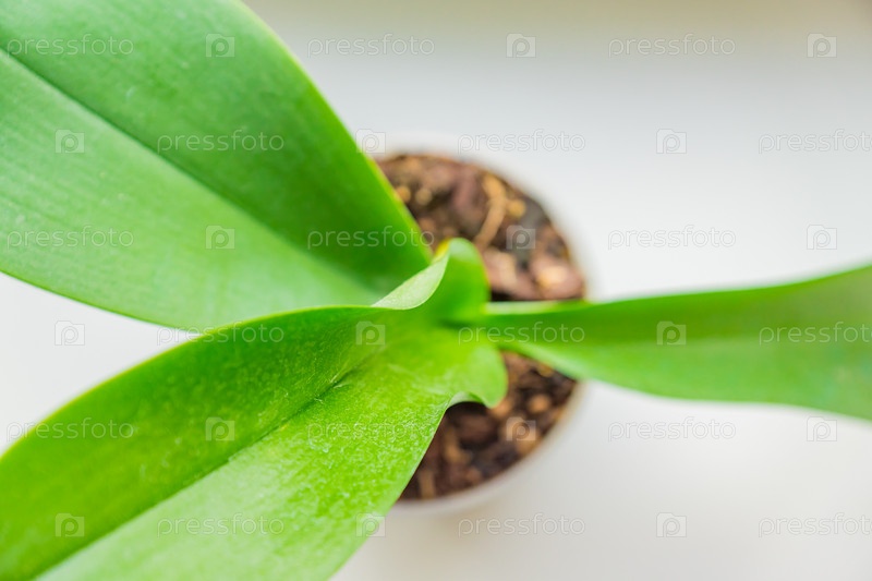 Вид сверху pf зеленые листья цветок орхидеи мха. домашнее садоводство. селективный фокус
