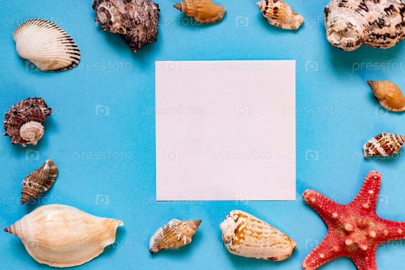 Морские раковины и морские звезды на голубом фоне с копировальным пространством. концепция летнего отдыха и отпуска
