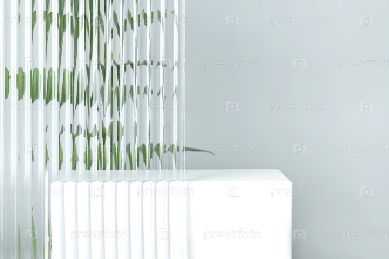 Пустой белый подиум на сером фоне с плексигласом и веткой рускуса за ним. Подиум-пьедестал для презентации косметической продукции