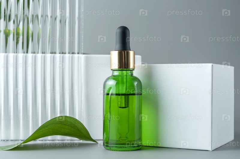 Зеленая стеклянная косметическая бутылка с капельницей на сером фоне с белыми подиумами и тропическими листьями. Концепция натуральной косметики, натуральные эфирные масла и средства по уходу за кожей