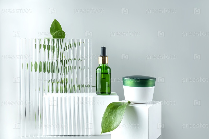 Антивозрастная коллагеновая сыворотка для лица в зеленой стеклянной бутылке и крем для лица на белом фоне подиума с копией пространства. Натуральная органическая косметика. Макет для брендинга