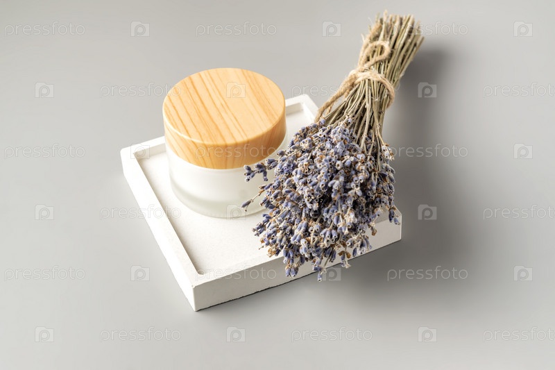 Банка из белого матового стекла с кремом из лаванды, букет цветов из сушеных фиолетовых цветов лаванды на бетонном квадратном подносе. Травяная ароматерапия и уход за кожей