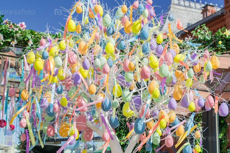 Красочное пасхальное яйцо. осветляет яйца, свисающие с веток