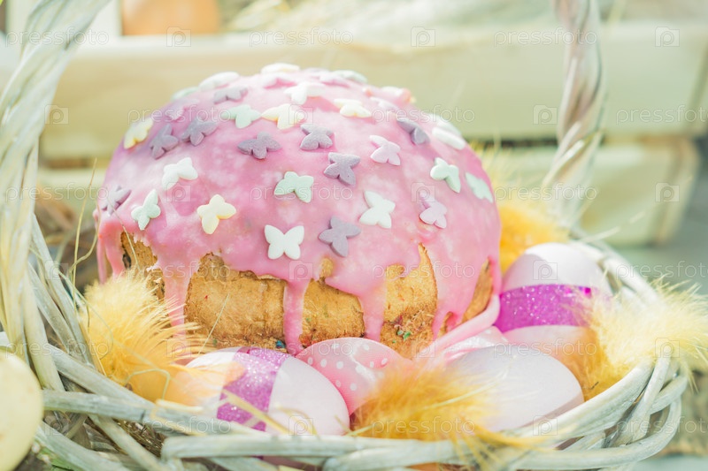 Закройте кулич с глазурью и крашеными яйцами в розовых тонах