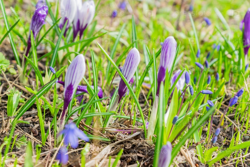 Красочные фиолетовые крокусы и цветы Blue scilla siberica цветят в солнечный весенний день в саду