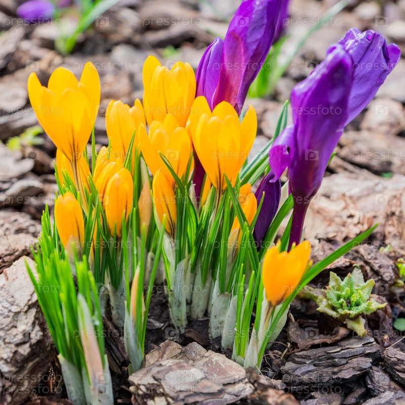Красочные фиолетовые и желтые цветы крокуса цветут в солнечный весенний день в саду