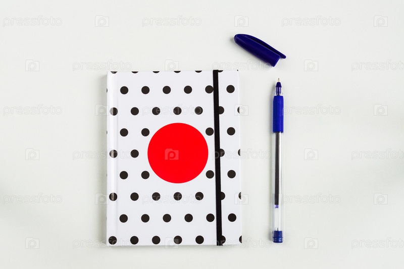 Черно-белая записная книжка в горошек с красным кругом на обложке и синей ручкой на белом столе. вид сверху, минимальная плоская планировка