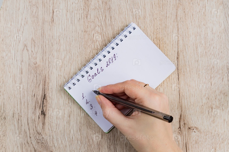 Руки молодой женщины держат открытые страницы блокнота с черной ручкой на деревянном столе. Список целей на 2019 год