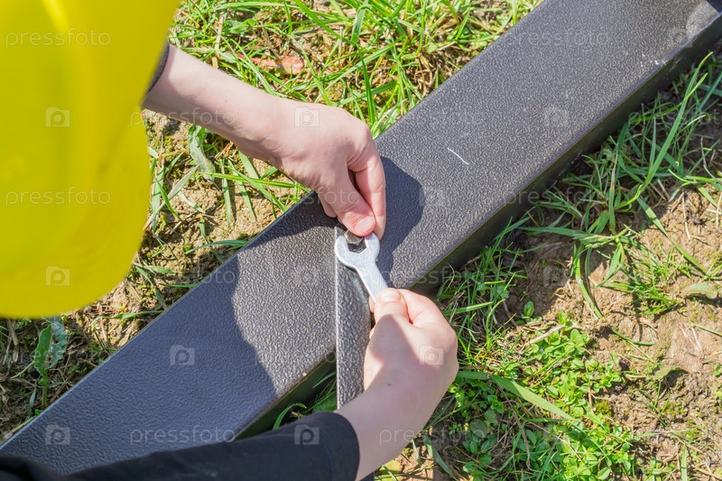 Мальчик в желтом сфз с ручным инструментом собирает металлоконструкции на открытом воздухе