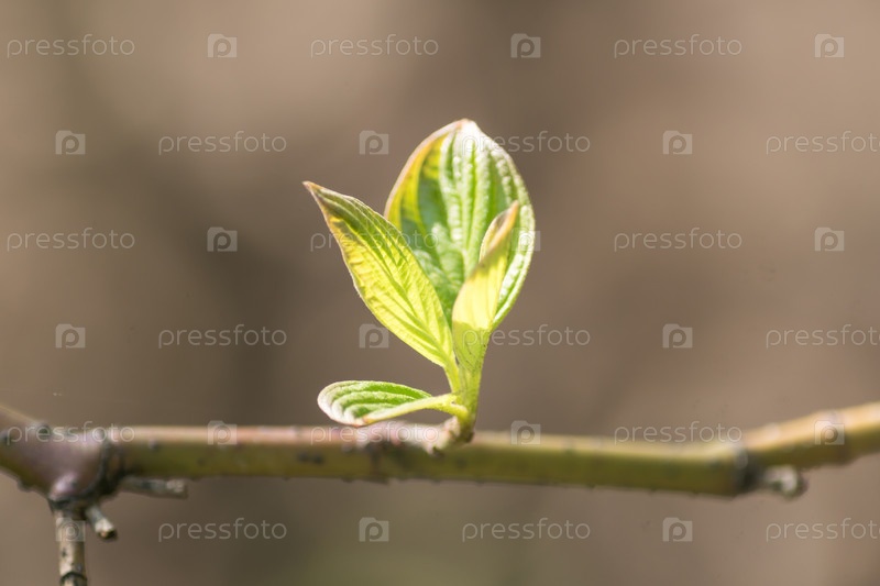 Закройте ветку дерева с первыми листьями почек. Весенний фон с копией пространства