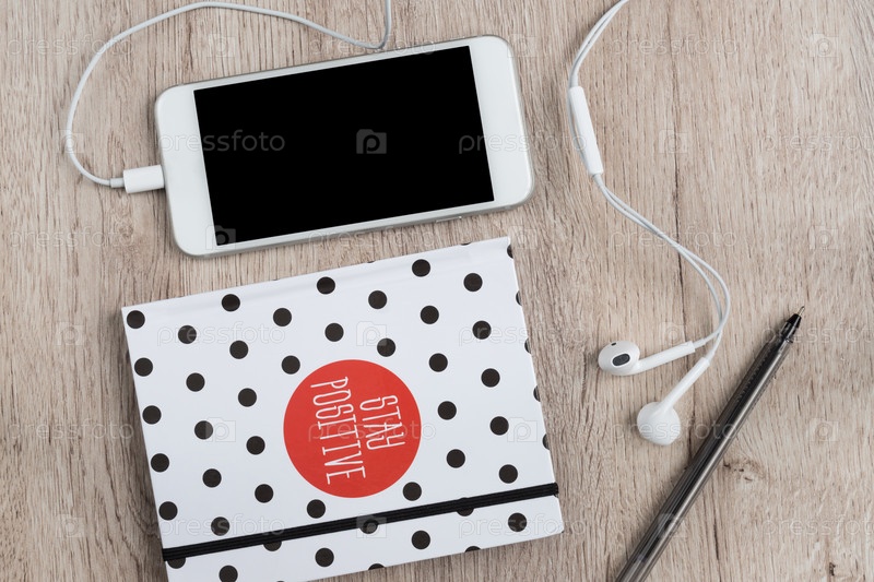 Концепция дела и офиса - пустой блокнот, смартфон и черная ручка на деревянном столе. Минимальная плоская планировка, вид сверху