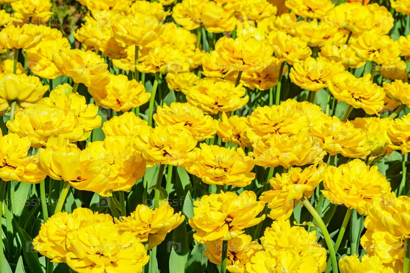 Поле желтых тюльпанов. Цветочный фон. Пейзаж летнего сада