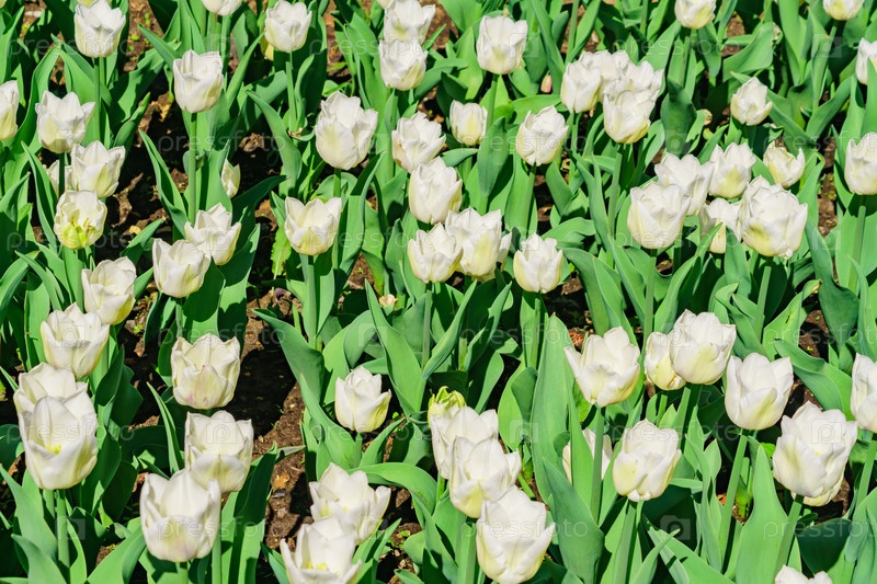 Поле белых тюльпанов. Цветочный фон. Пейзаж летнего сада