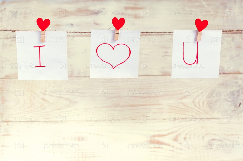 Красные штыри сердца влюбленности валентинки вися на естественном шнуре против белой деревянной предпосылки. Я люблю тебя надпись на кусочках бумаги
