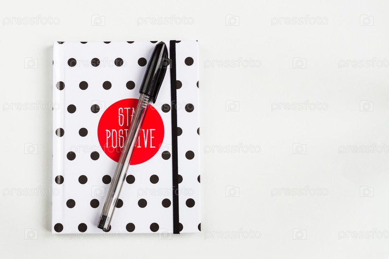 Черно-белая записная книжка в горошек с красным кругом на обложке и черной ручкой на белом столе. вид сверху, минимальная плоская планировка