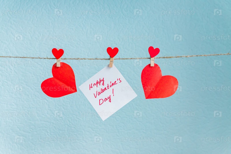 Красные штыри сердца влюбленности валентинки висят на естественном шнуре против голубой предпосылки