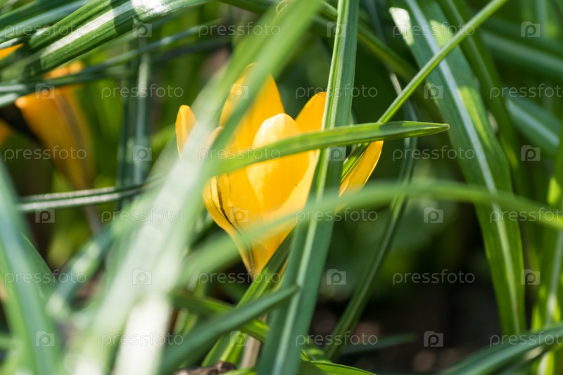 Красочный желтый цветок крокуса цветет в солнечный весенний день в зеленой траве