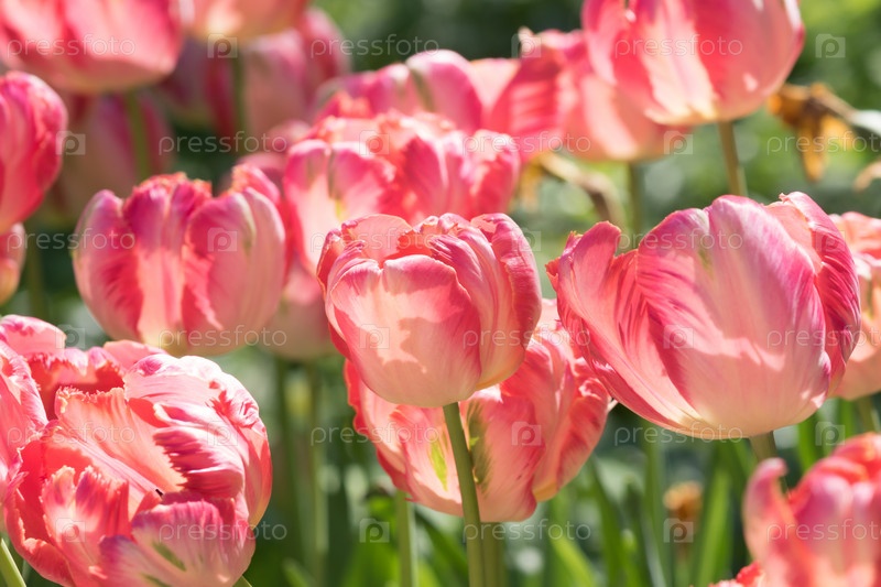 Поле цветущих розовых тюльпанов. Цветочный фон. Пейзаж летнего сада