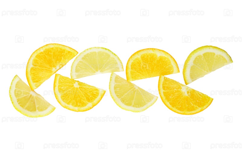 Ломтик цитрусовых, половинки апельсинов и лимонов на белом фоне, обтравочный контур