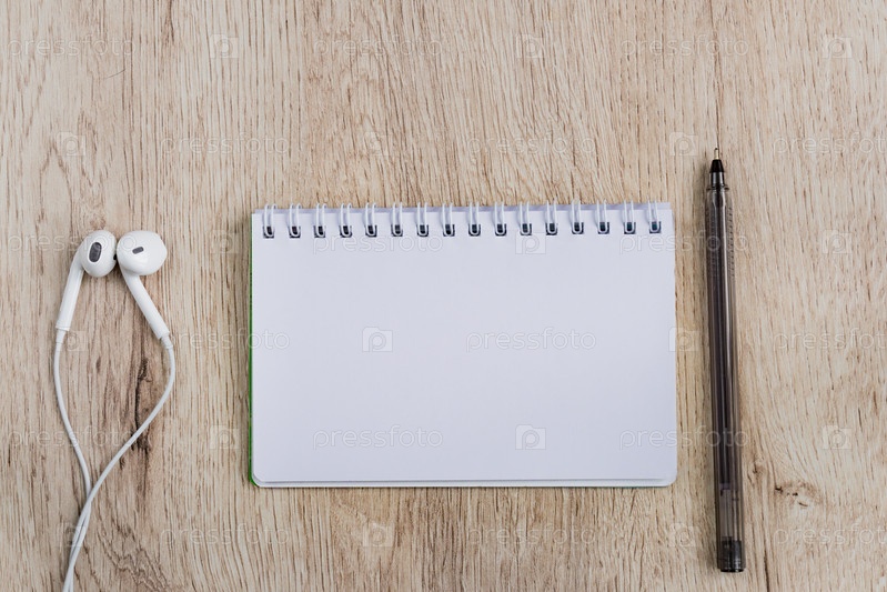 Концепция дела и офиса - пустой блокнот, наушники и черная ручка на деревянном столе. Минимальная плоская планировка, вид сверху