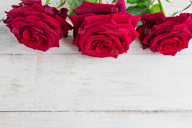 Три свежие цветущие розы на белом деревянном фоне с копией пространства