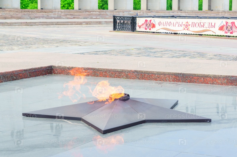 Москва, Россия - 16 мая. 2018: Вечный огонь в парке Победы на Поклонной горе в честь советских солдат, павших в Великой Отечественной войне