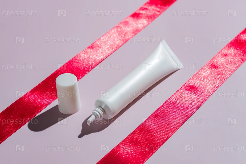 Макет косметической косметики для макияжа бутылки крема для глаз с концепцией ухода за кожей и здравоохранения на розовом фоне с красными атласными лентами. Минимальный стиль
