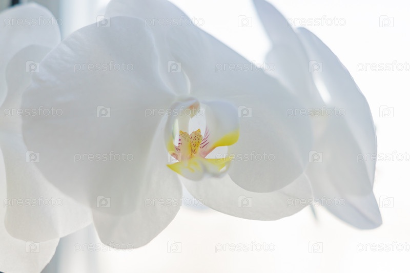 Coseup цветущей белой орхидеи фаленопсис на подоконнике. Домашнее садоводство, экзотическое растение