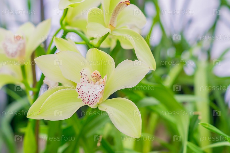 Желтые экзотические цветы орхидеи в ботаническом саду