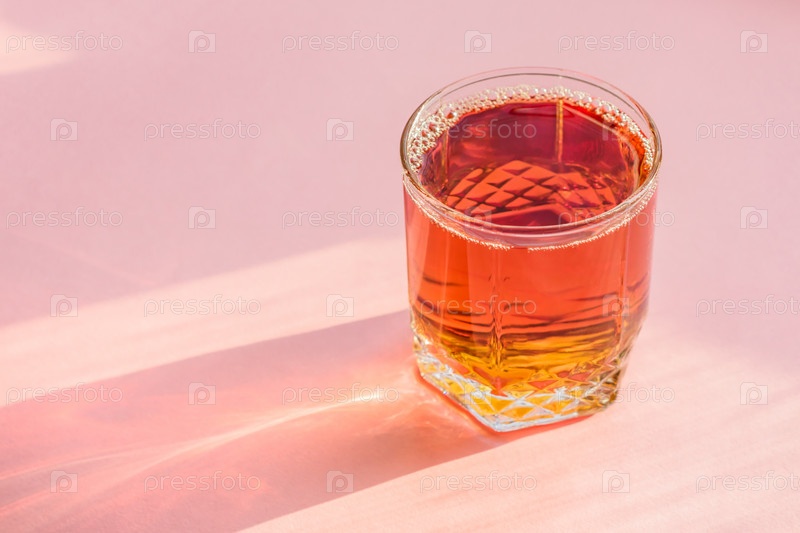 Стакан яблочного сока на розовом фоне. Безалкогольный напиток