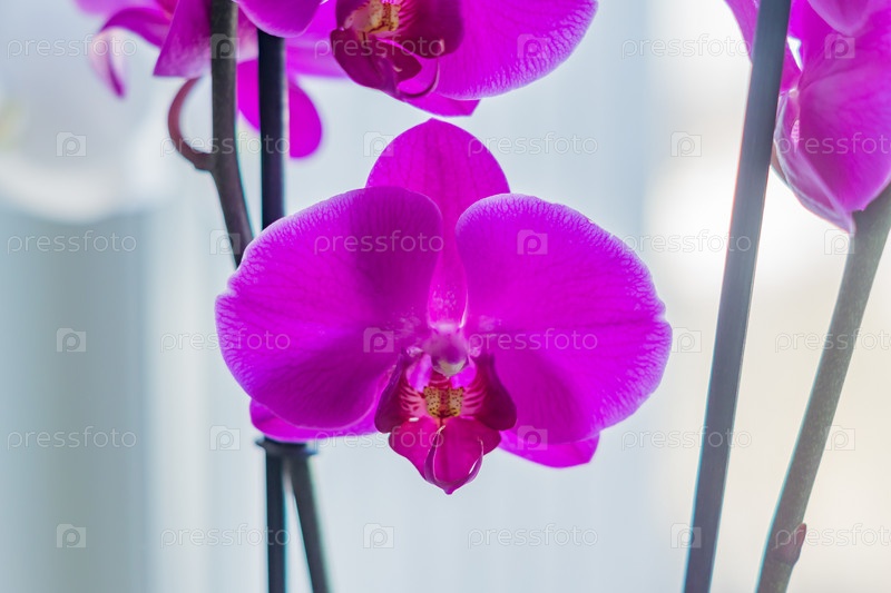 Coseup цветущей фиолетовой орхидеи фаленопсис на подоконнике. Домашнее садоводство, экзотическое растение