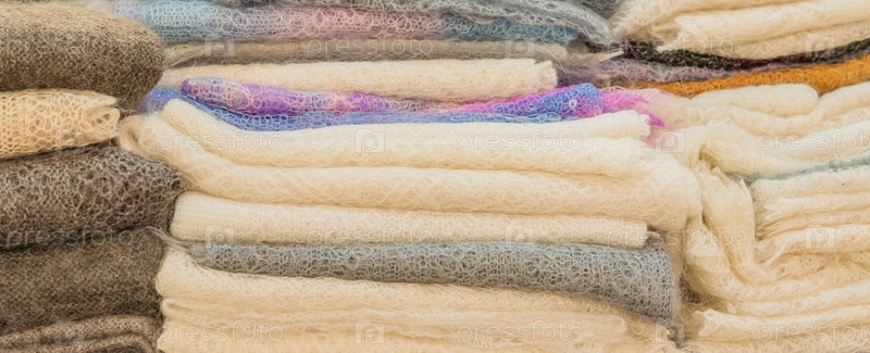 Стопка вязаных пуховых шарфов для фона. Знаменитые русские оренбургские платки. Схема вязания крючком. Баннер
