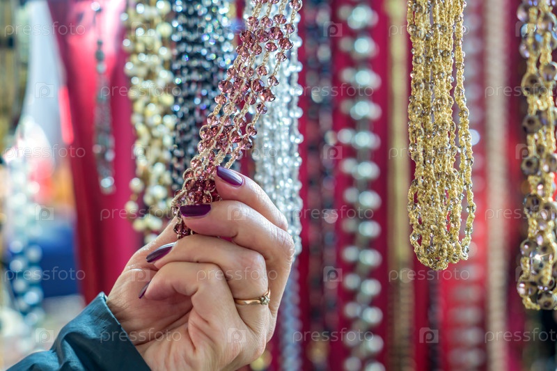 Женщина выбирает красочные ожерелья из хрустальных бусин. Фоновый узор. Модное женское рукоделие